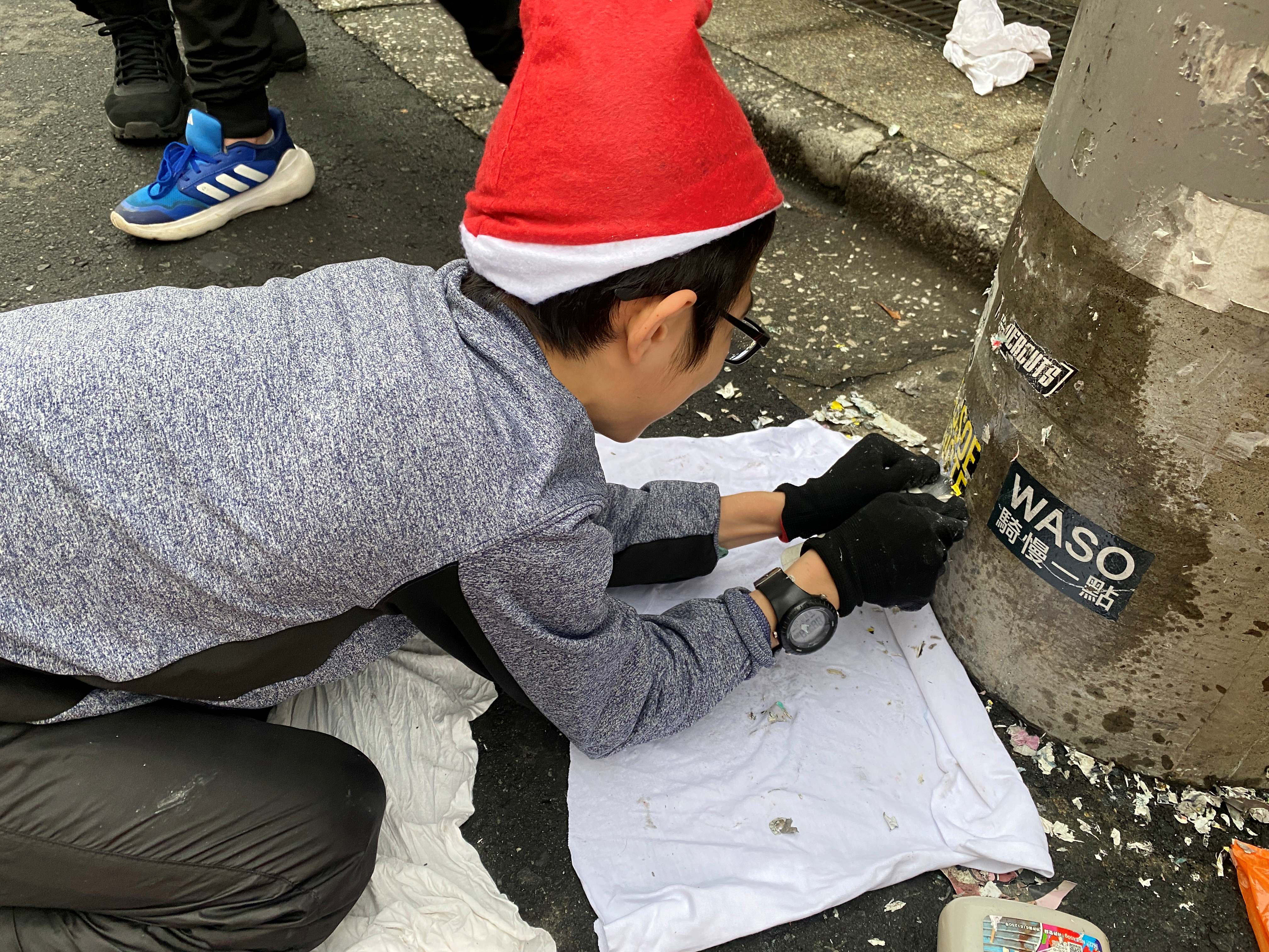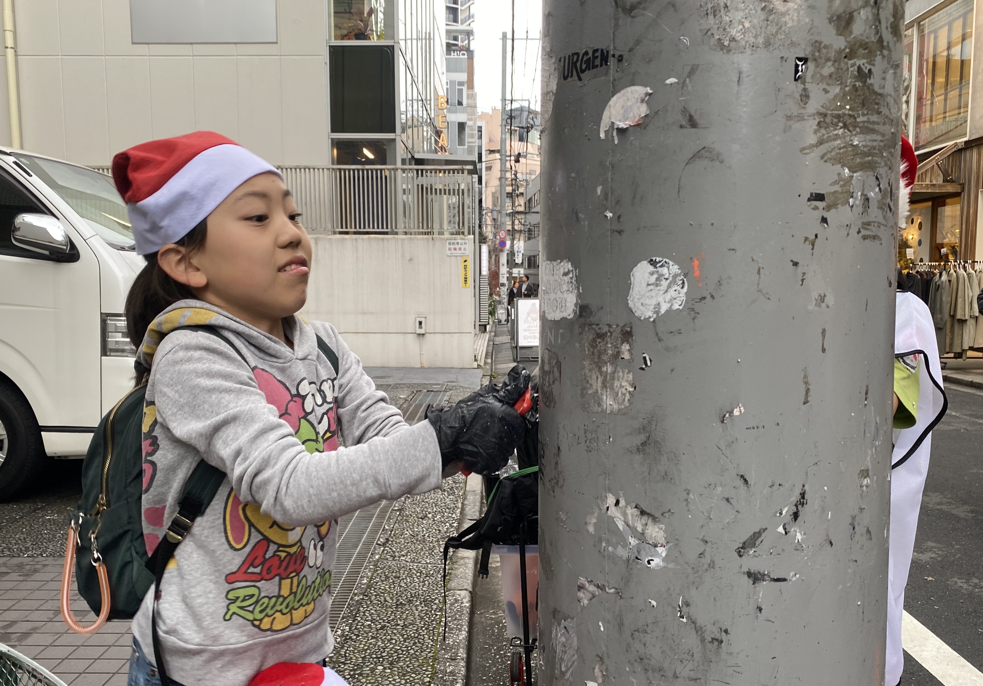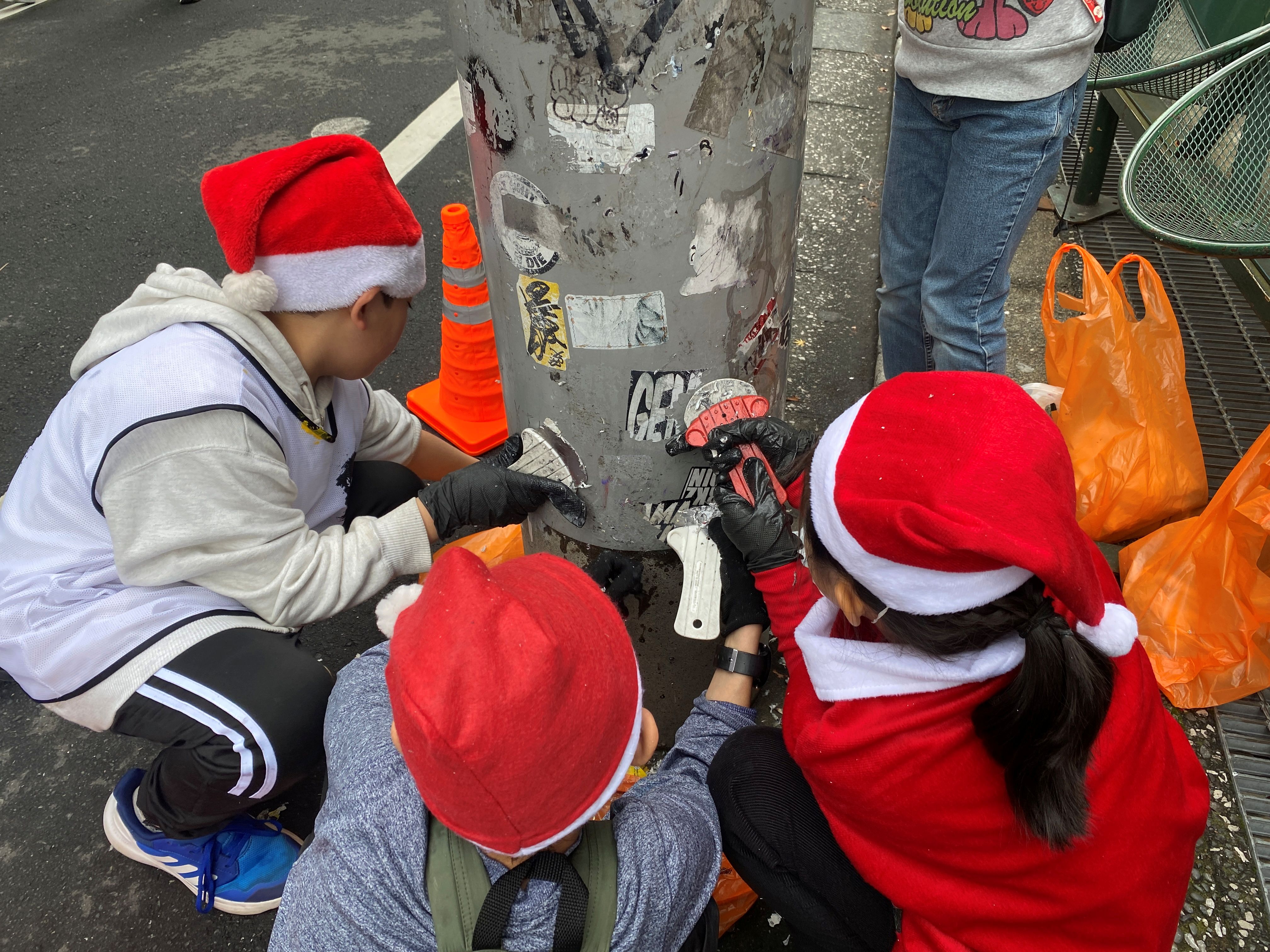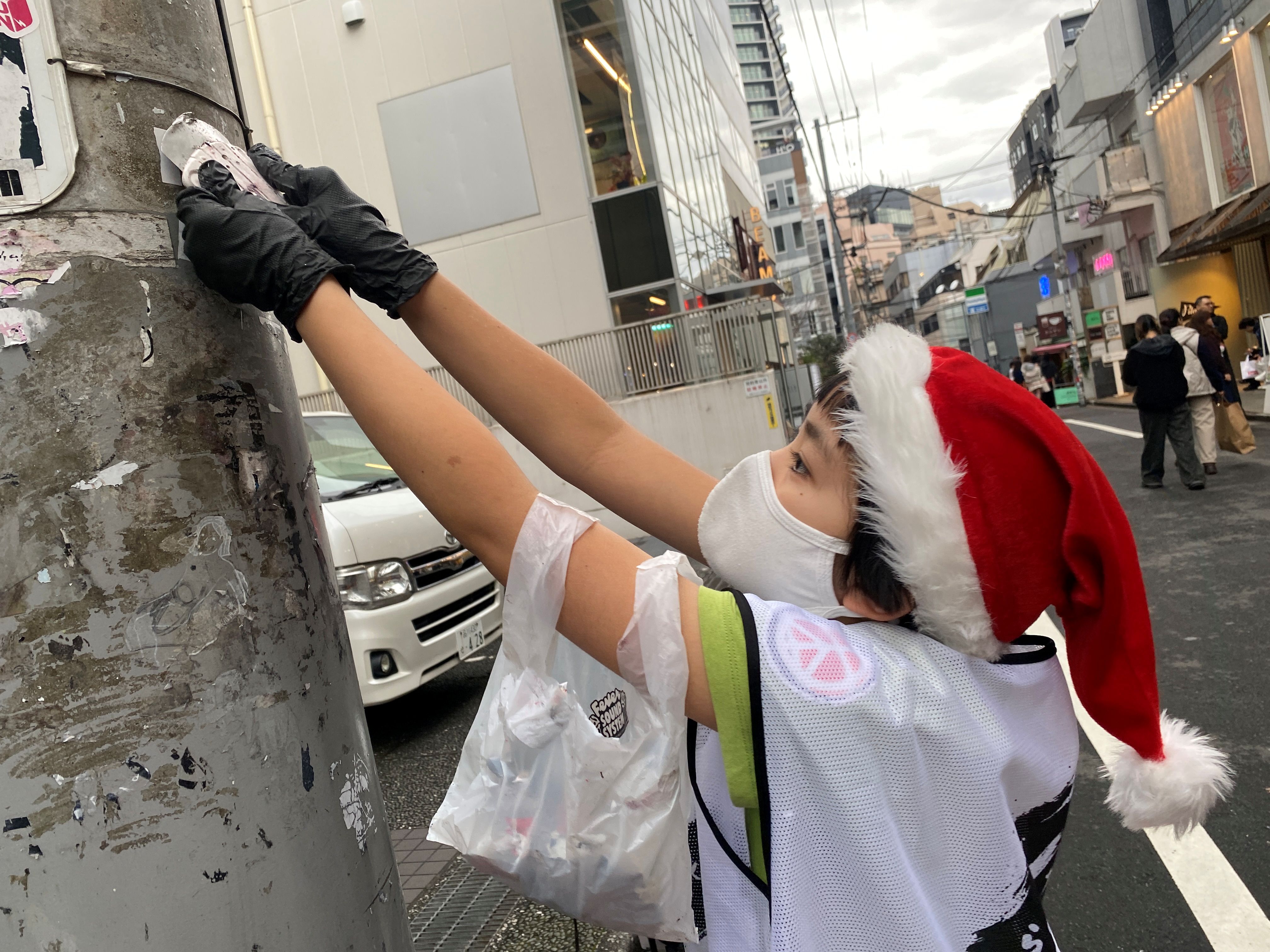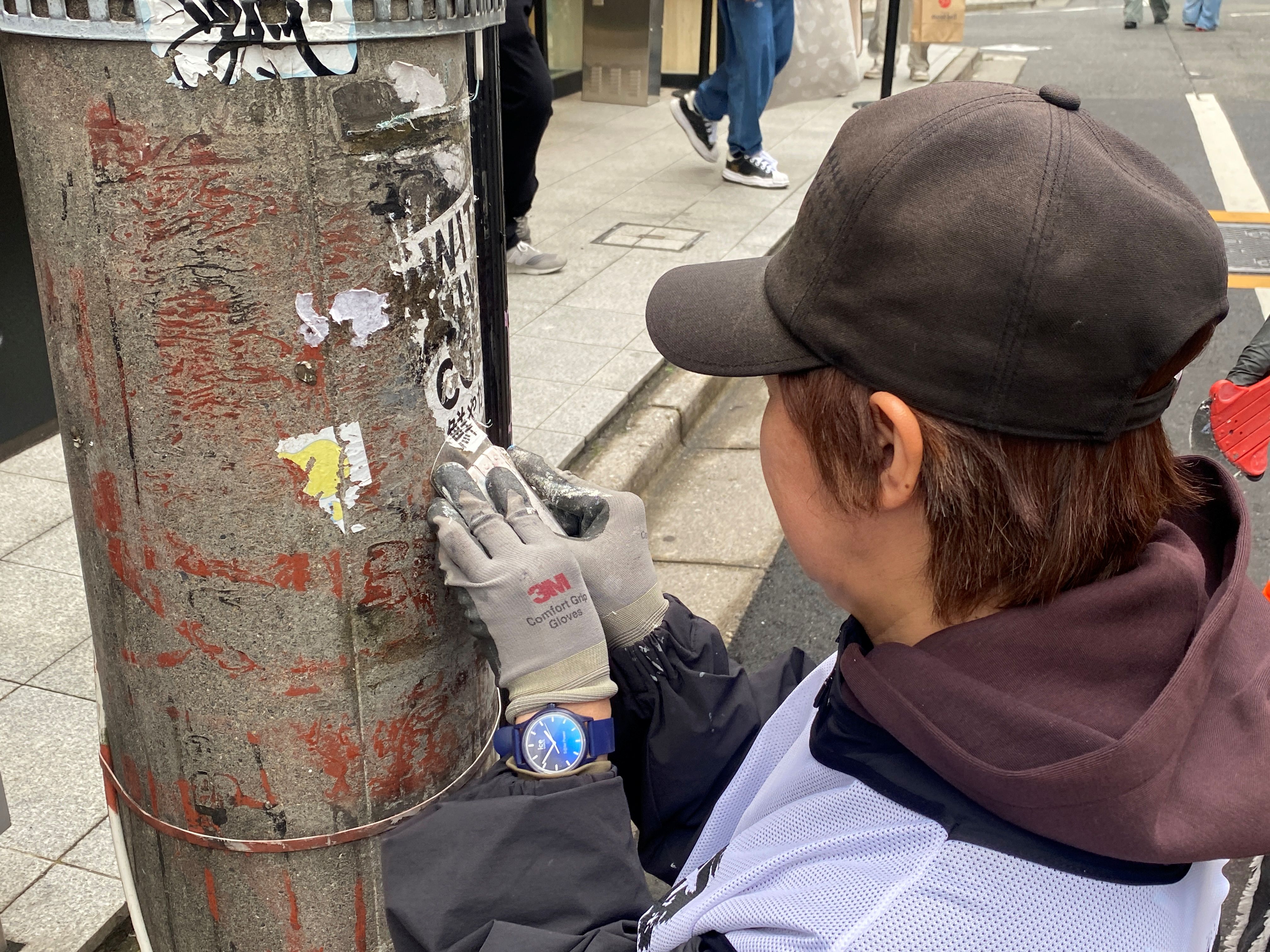 道路に落ちたシールのカスをほうきで集めたり。