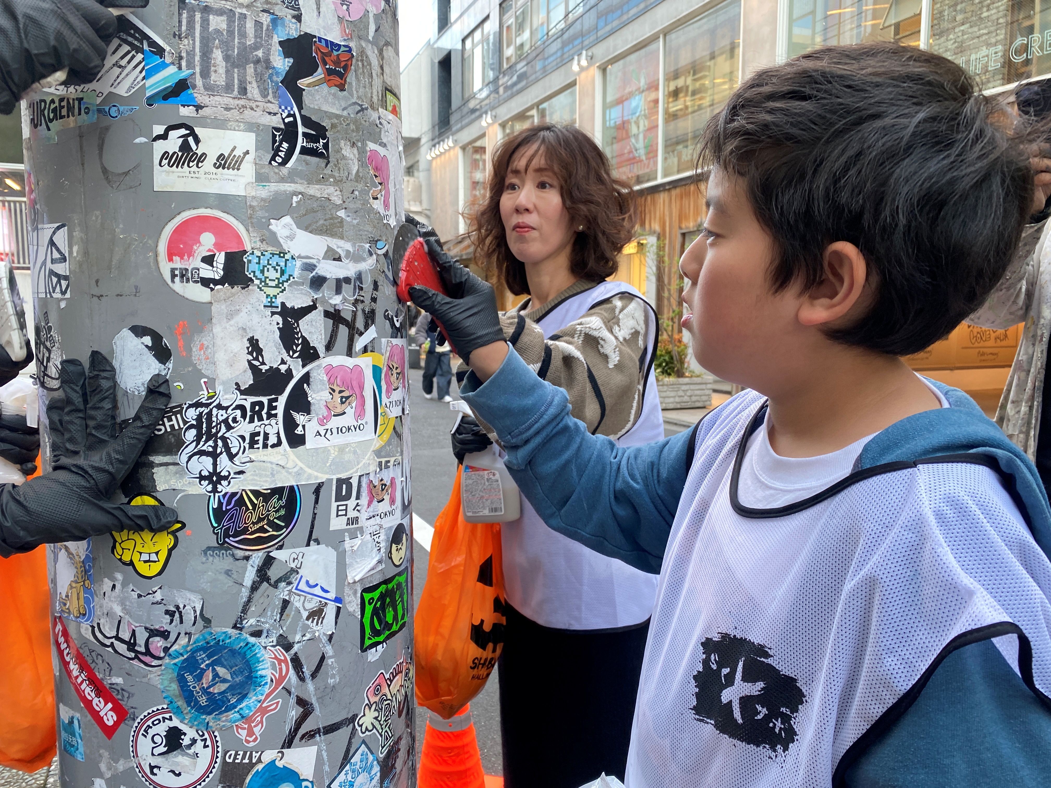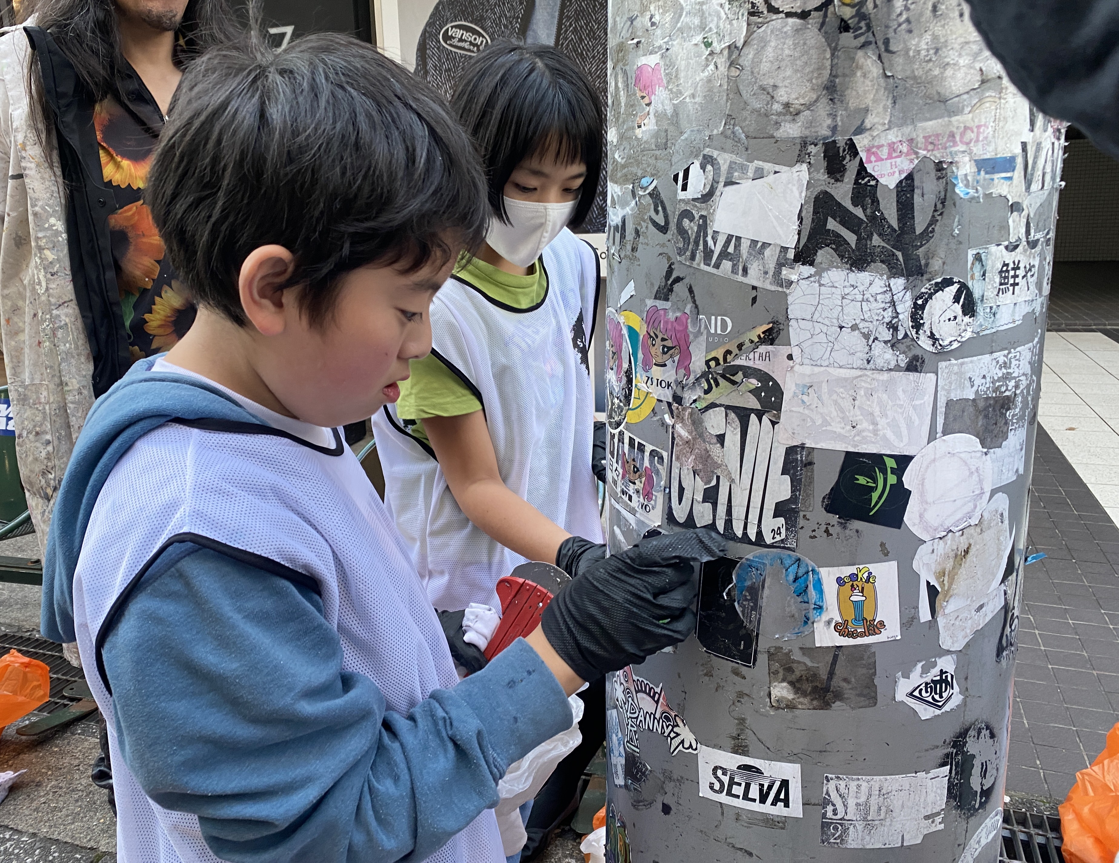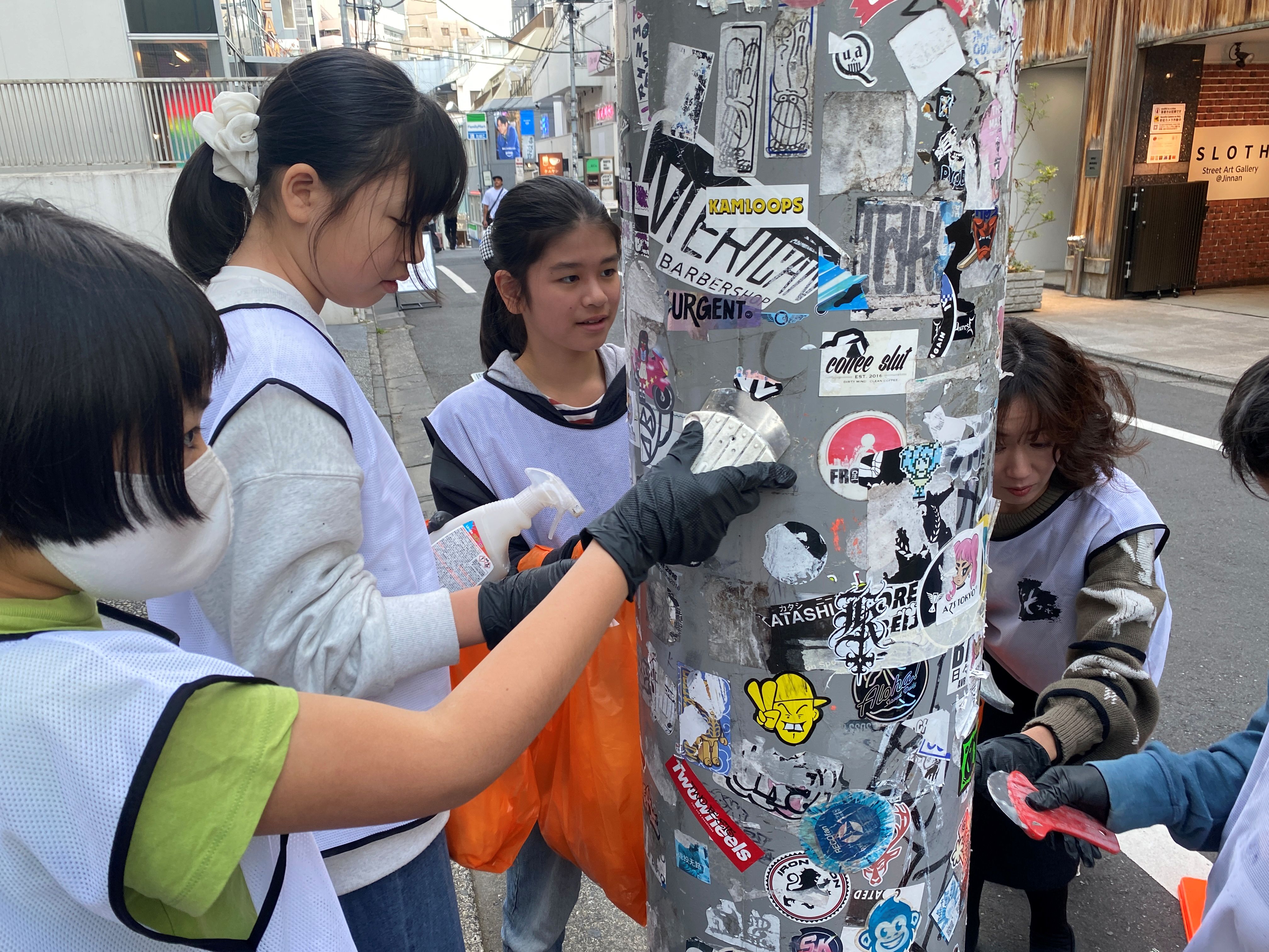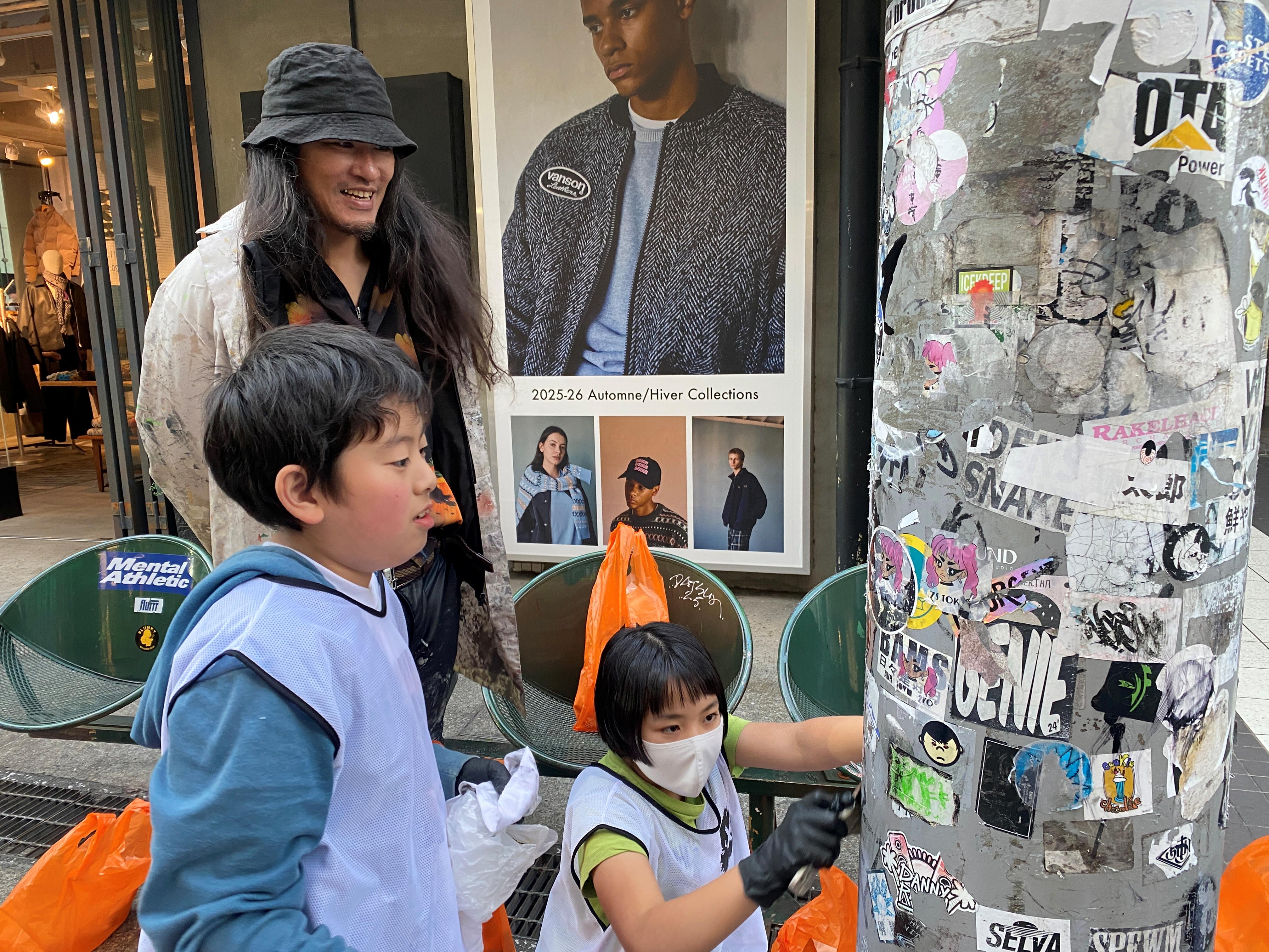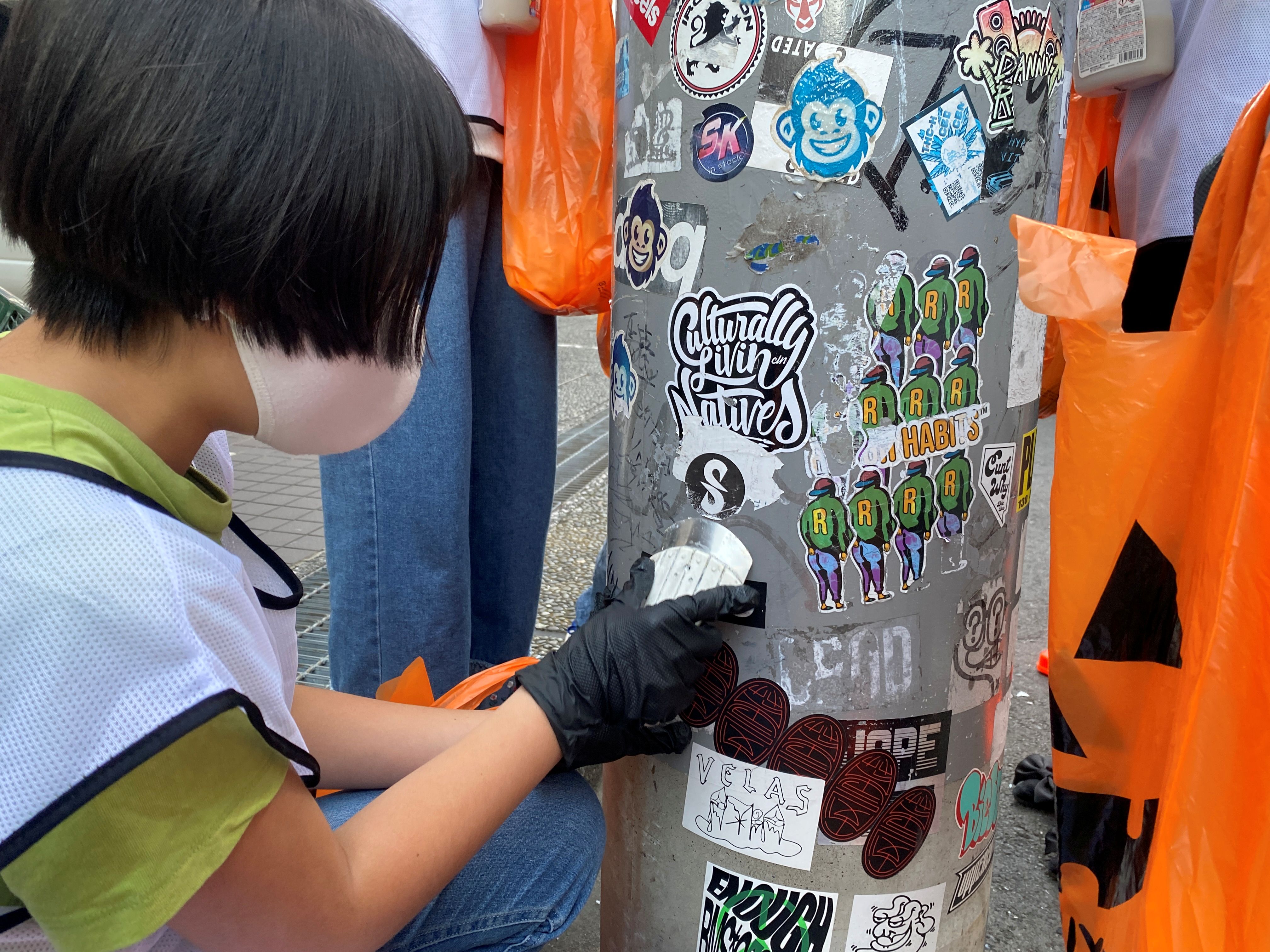 さて、振り返りの後は、お待ちかねの落書き消し&シール剥がし体験です。