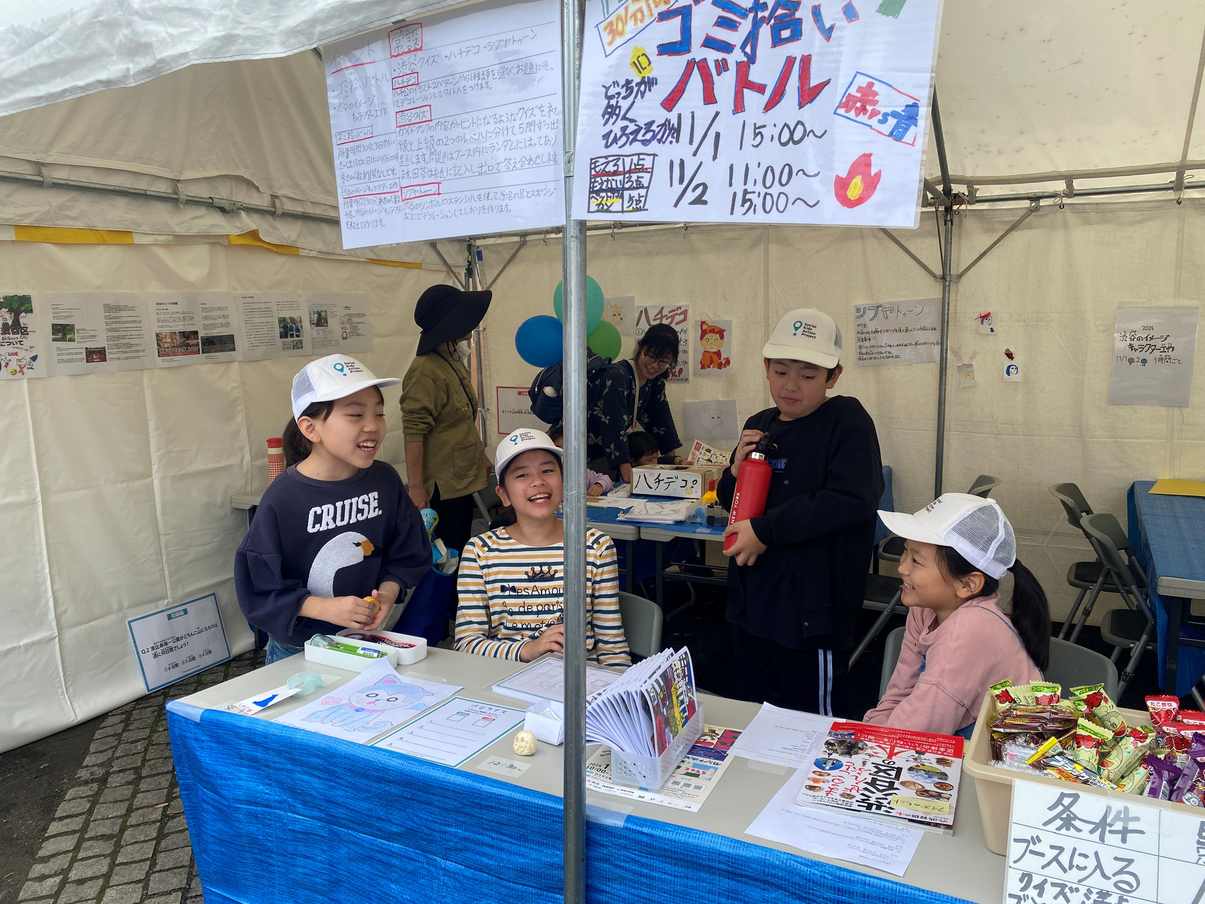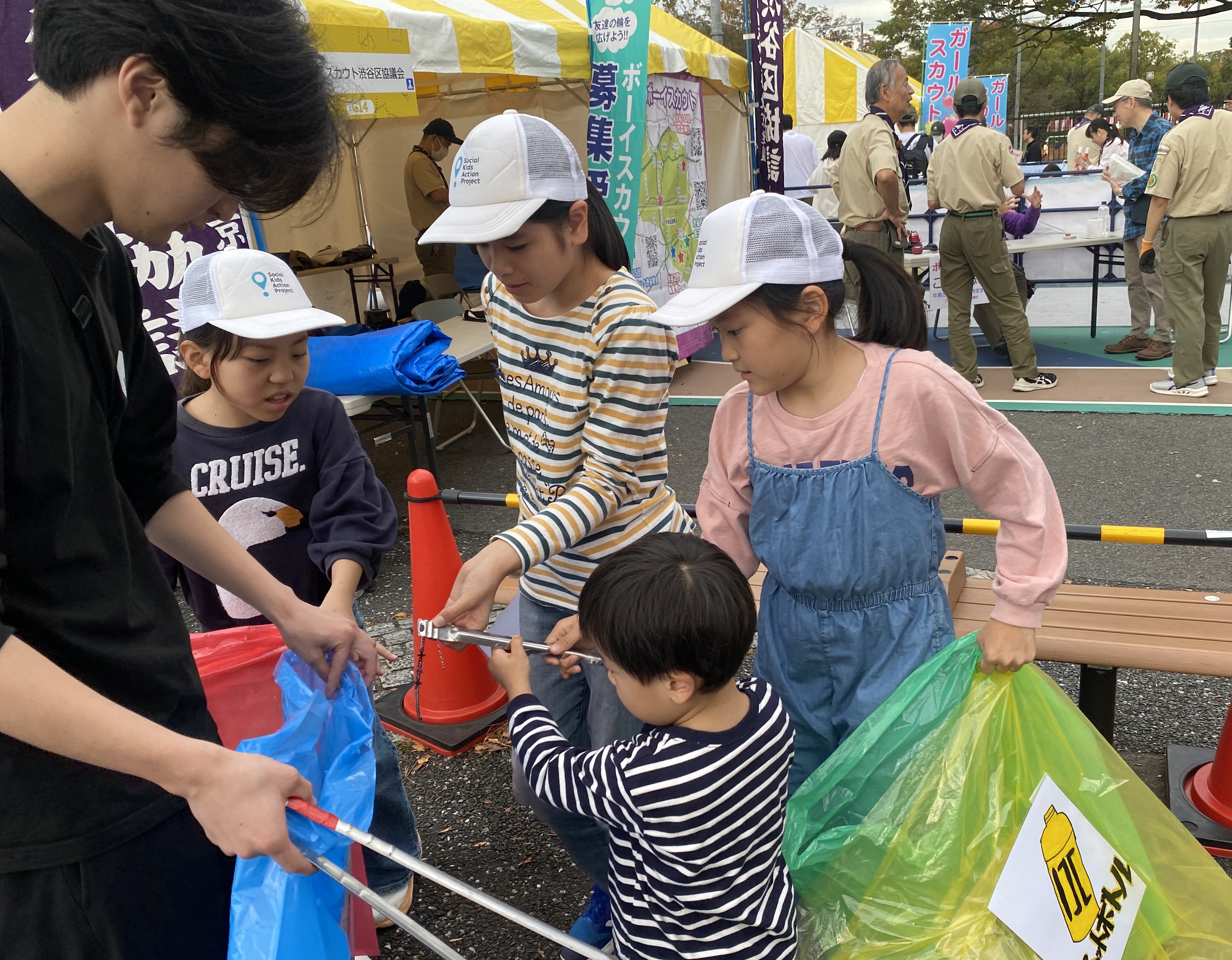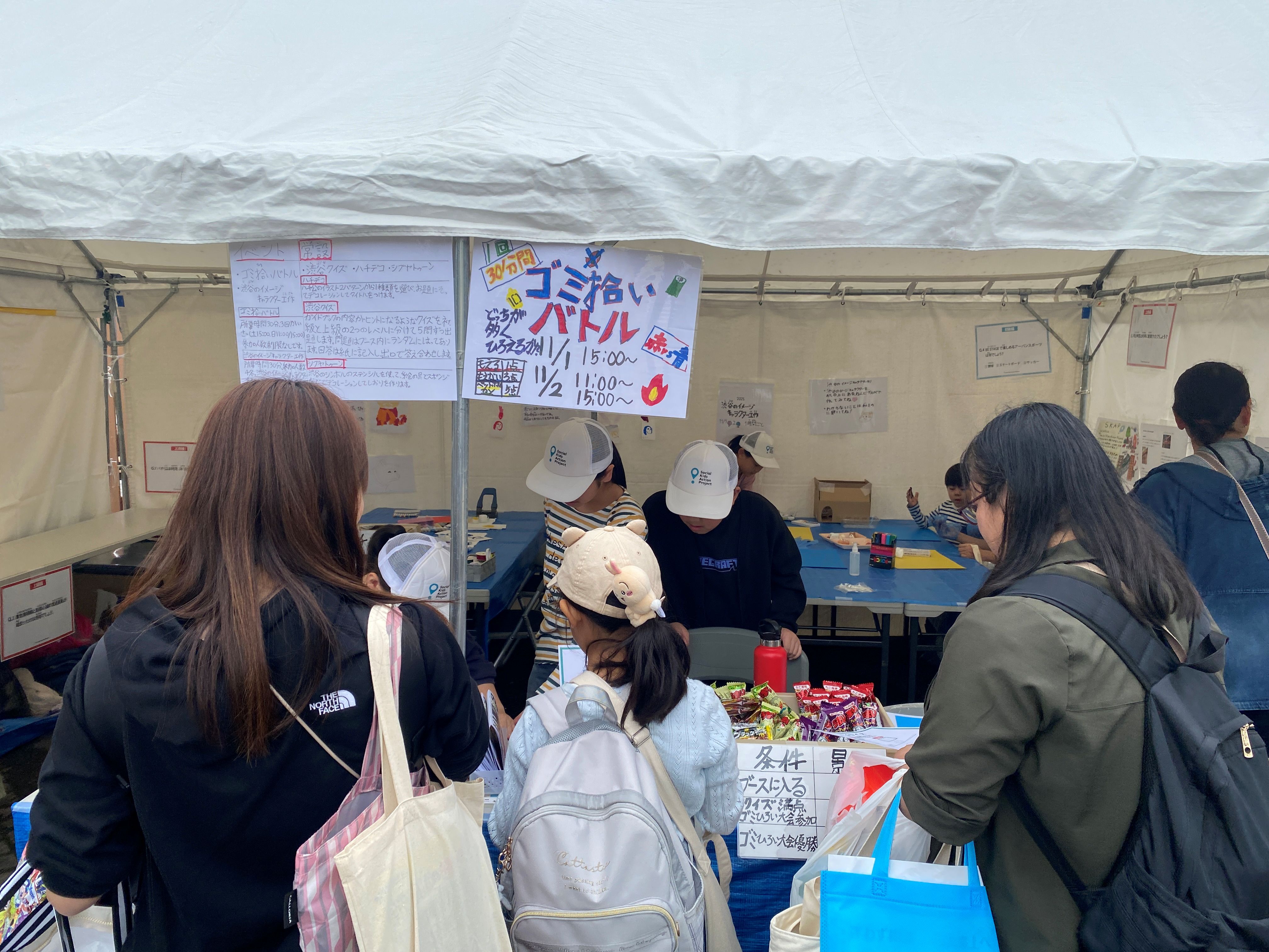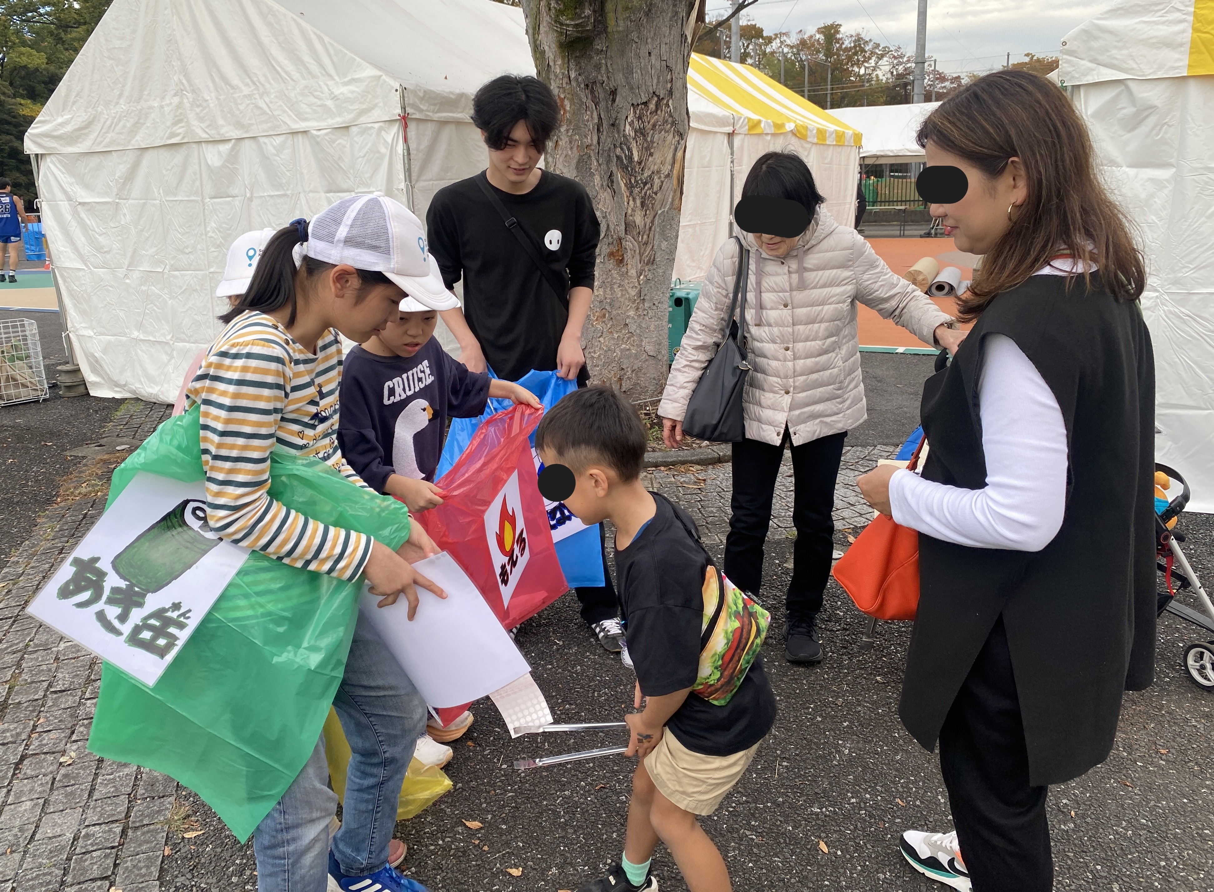 赤と青のチームに分かれてブースの周りでゴミ拾い。
