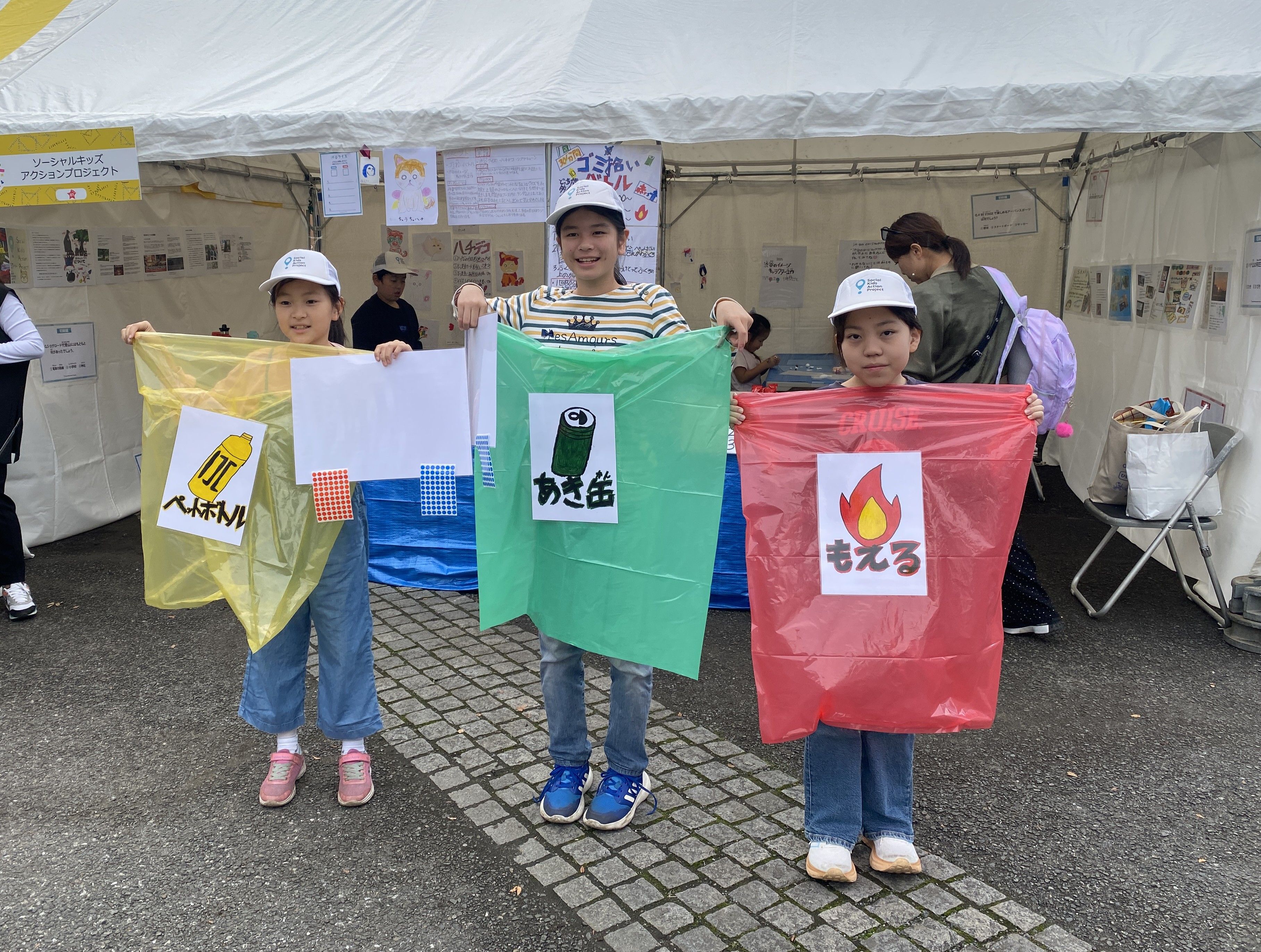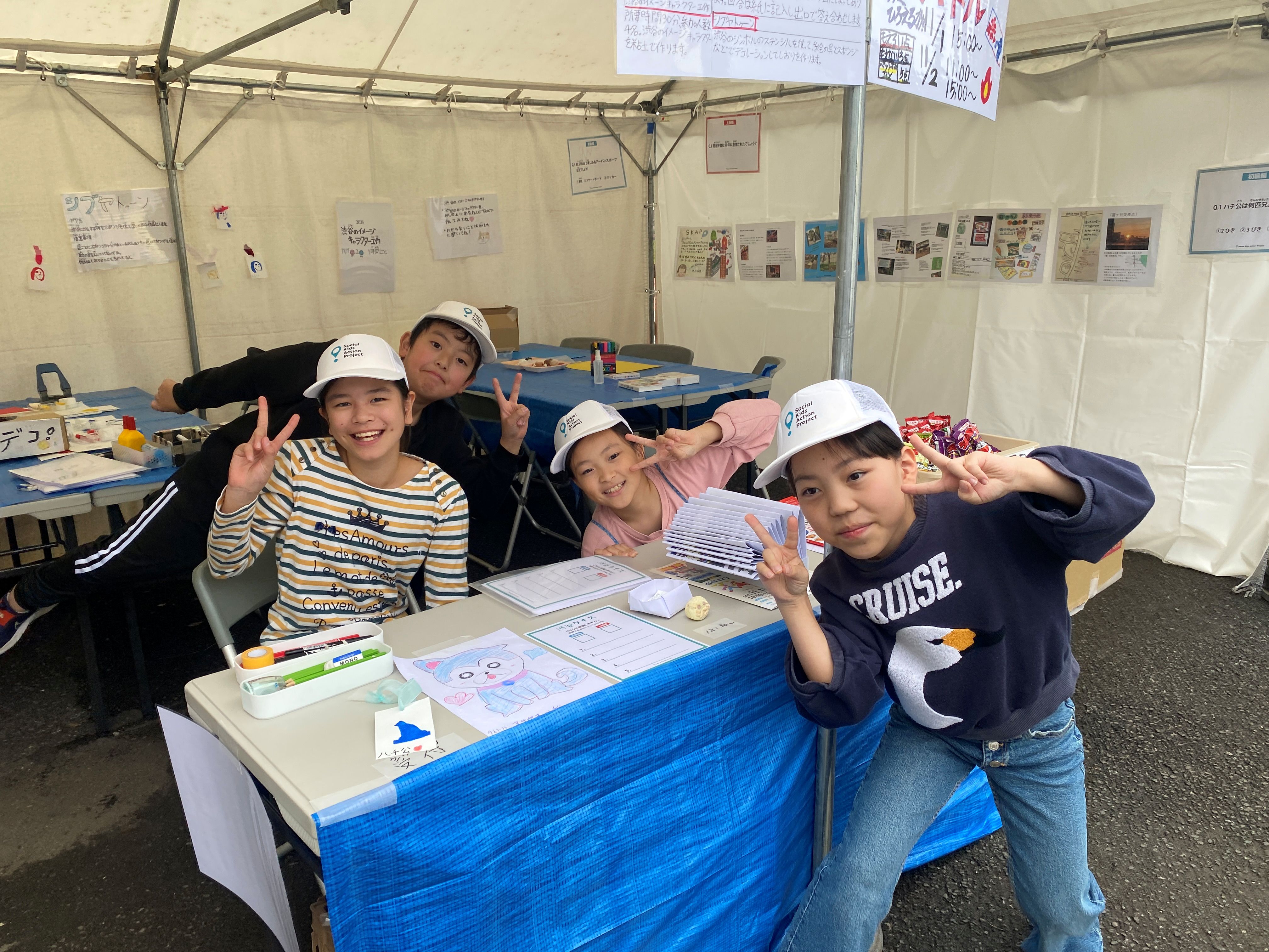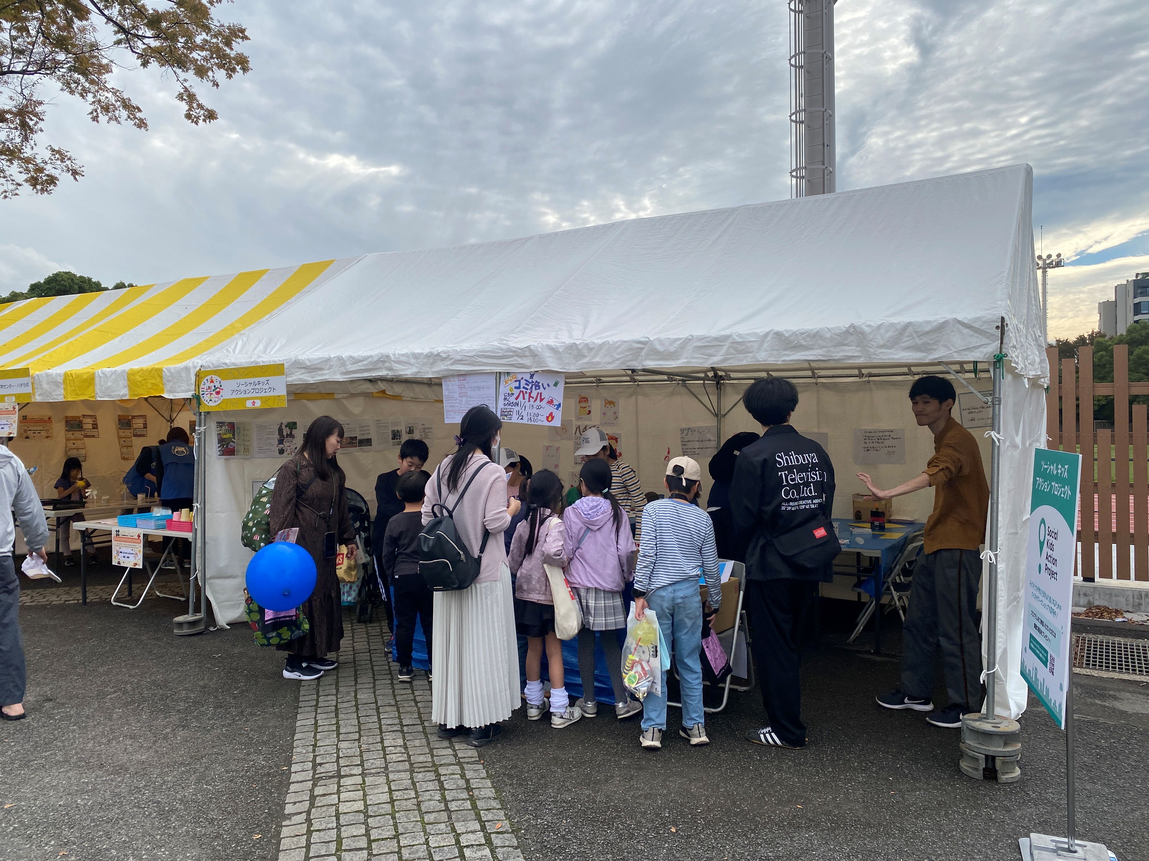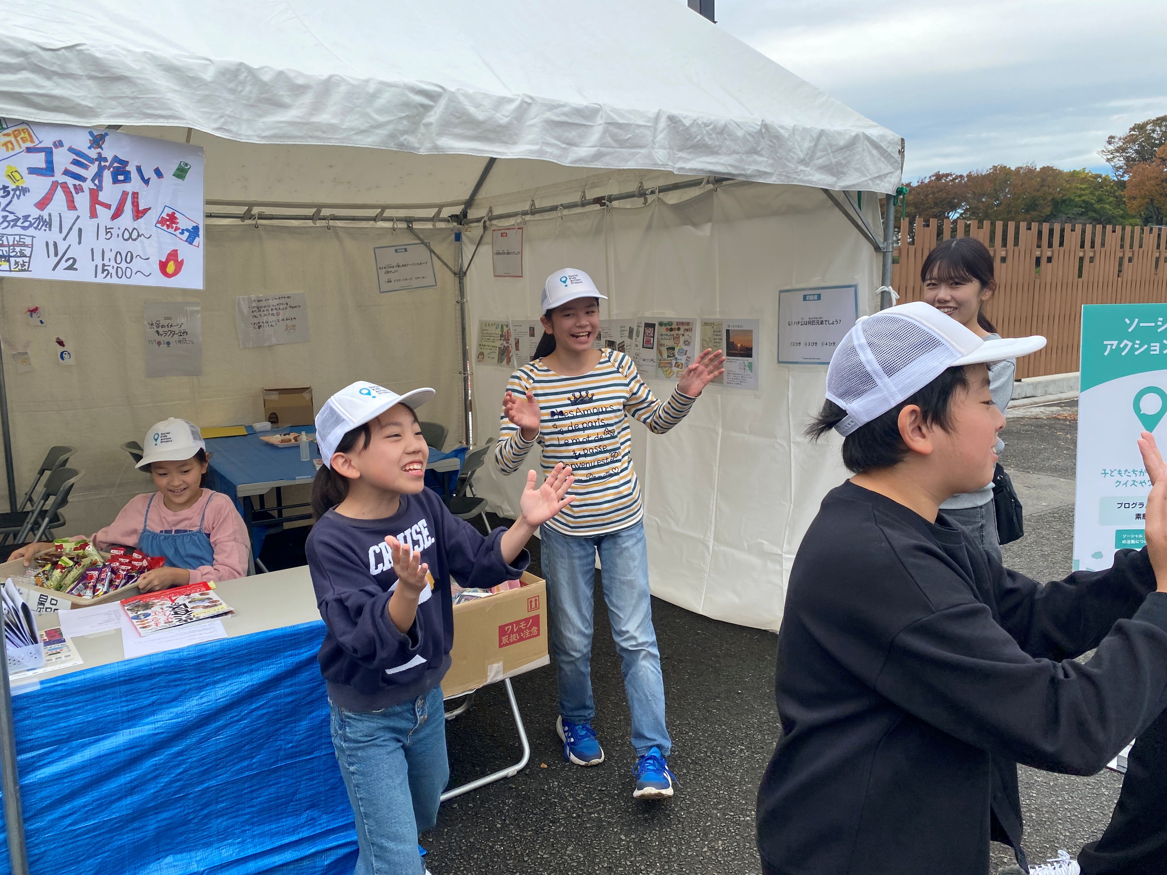 赤と青のチームに分かれてブースの周りでゴミ拾い。