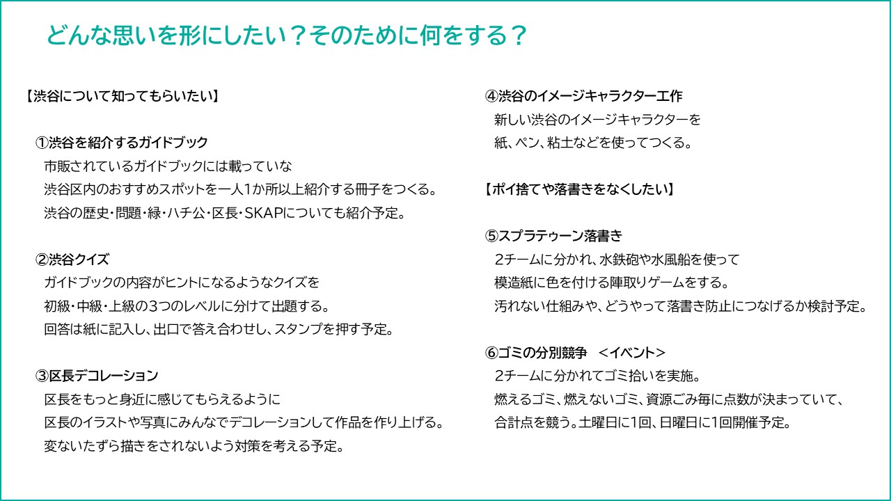 - 渋谷を好きになってもらうという観点はどのように入れ込むのか