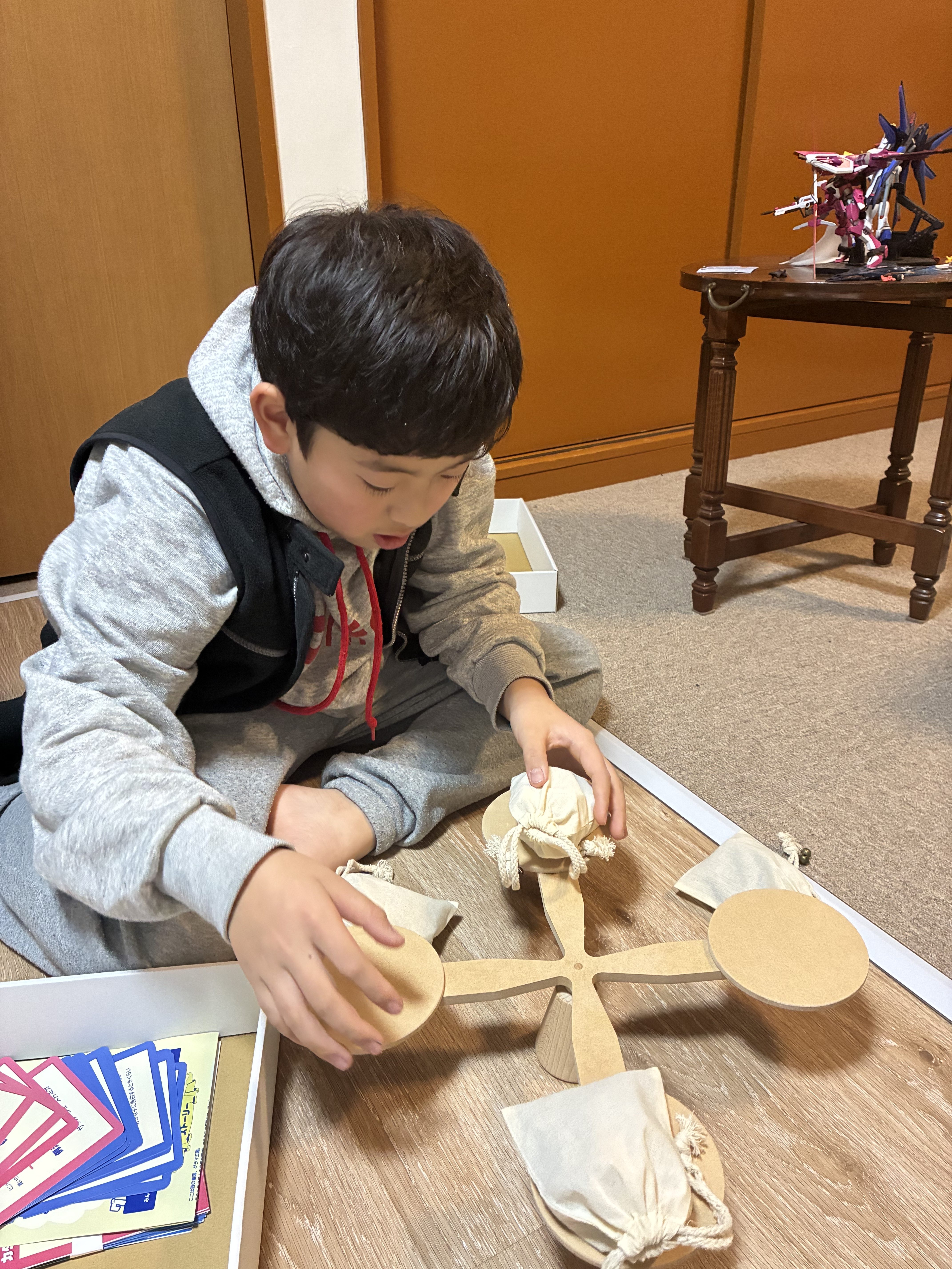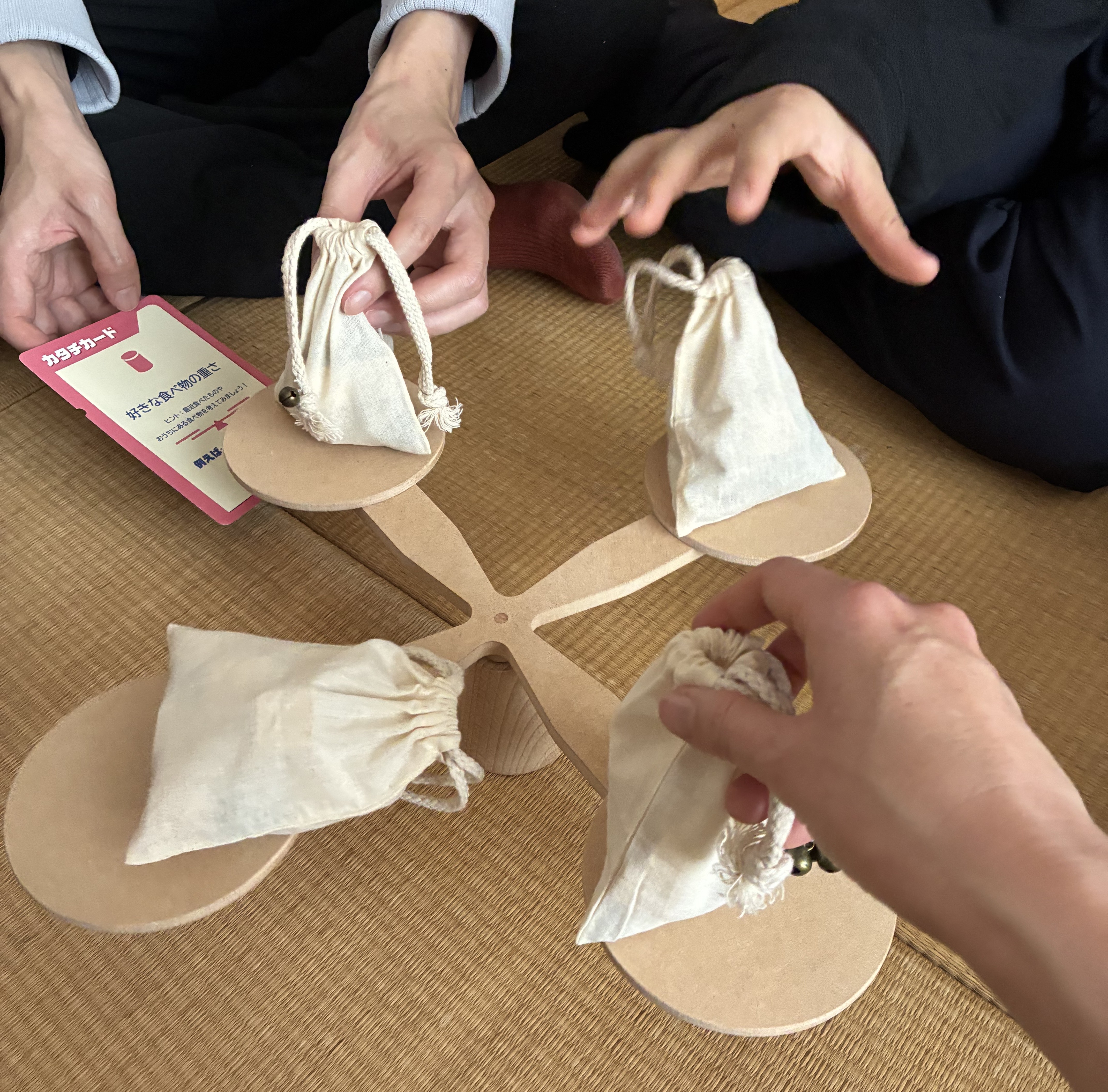 みんなの巾着袋の重さを揃えていく協力型のコミュニケーションゲームです。