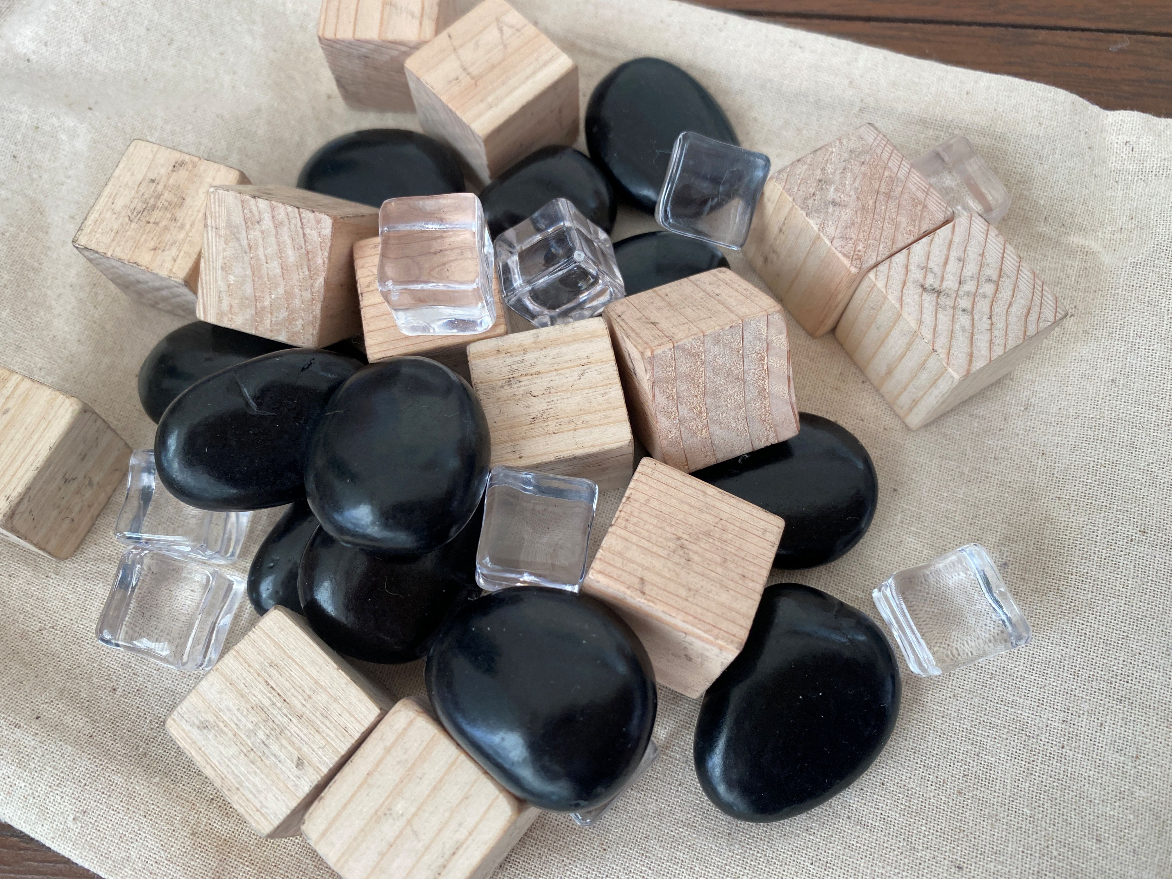 また、おもりは木材の四角いブロック、ガラスっぽいブロック、丸っこい石の3種類があり、